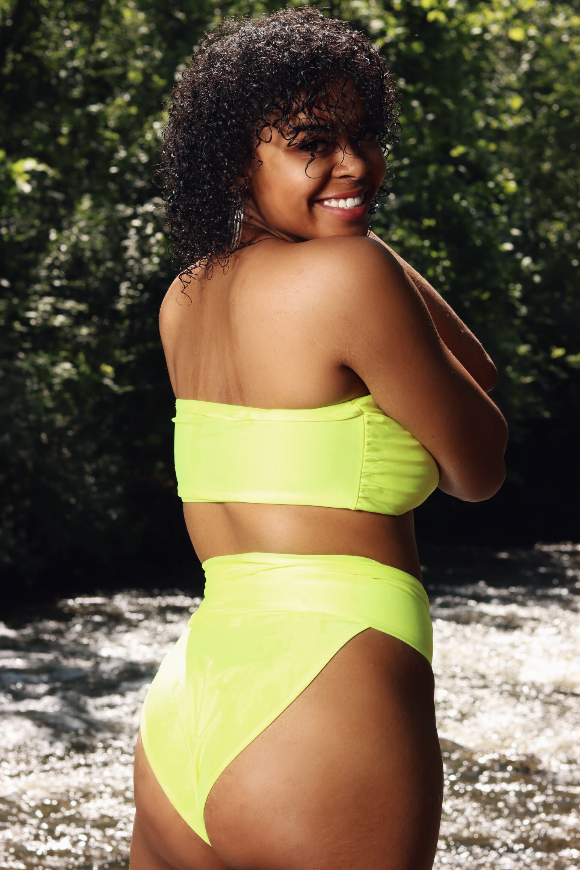 Our 3 color, super high waisted bikini set will be a summer ‘21 must have! The metal detail on both the top and bottom add some glamour to the bright, bold colors. Available in Teal, Black and Yellow. Sizes S-XL.